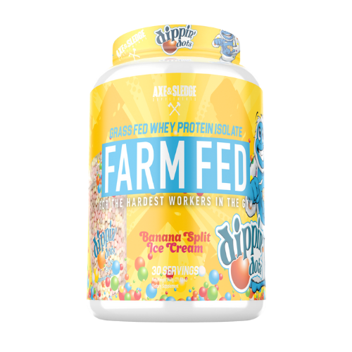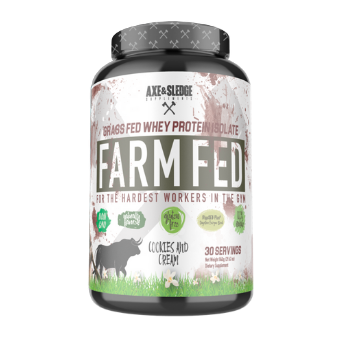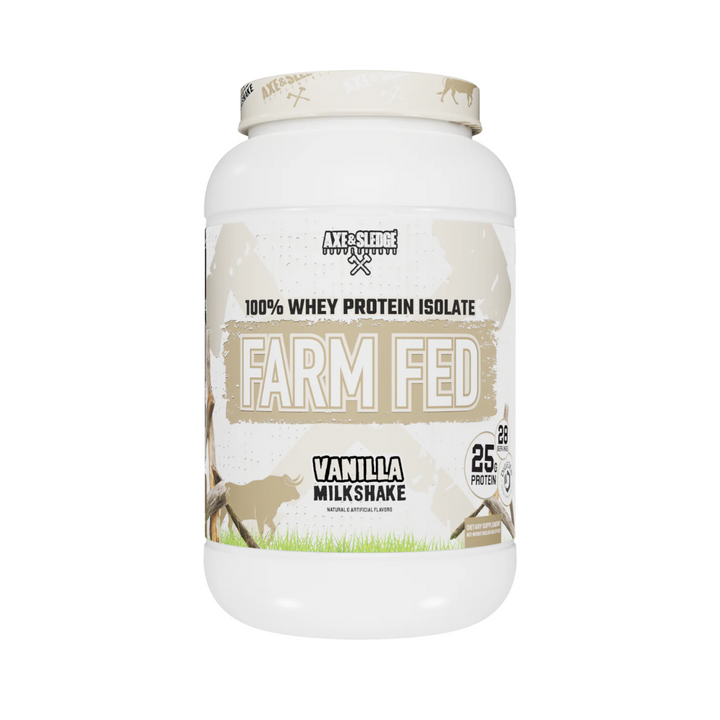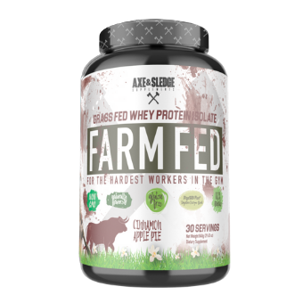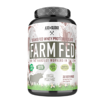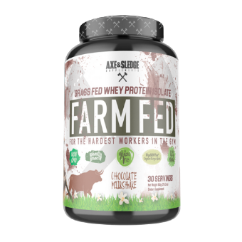 AXE AND SLEDGE FARM FED, THIS 100% GRASS-FED WHEY PROTEIN ISOLATE IS THE NEXT GENERATION IN NATURAL PROTEIN. PROTEIN IS AN ESSENTIAL PART OF BUILDING AND MAINTAINING YOUR MUSCLE, AND WE AT AXE AND SLEDGE DEMAND THAT OUR WHEY PROTEIN BE OF THE HIGHEST QUALITY! FARM FED IS A PROTEIN IN WHICH FARMERS HAVE FEED THEIR CATTLE NATURALLY WITHOUT THE UNNECESSARY USE OF SYNTHETIC HORMONES SUCH AS RBST AND RBGH.